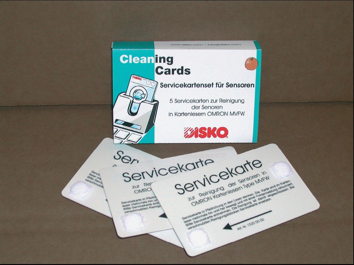 DISKO servisní karty, vyvinuté přímo pro čištění čidel, snadno vložíme do snímacího zařízení. Clona se otevře automaticky a snímací zařízení přečte magnetický kód. Servisní karta se uvnitř snímacího zařízení vícekrát pohne. Jakmile se to stane, všechna volně uložená čidla jsou vyčištěna speciálními čistícími vycpávkami na servisní kartě. Elektrické pole mezi čidly se po vyčištění obnoví na 100%.